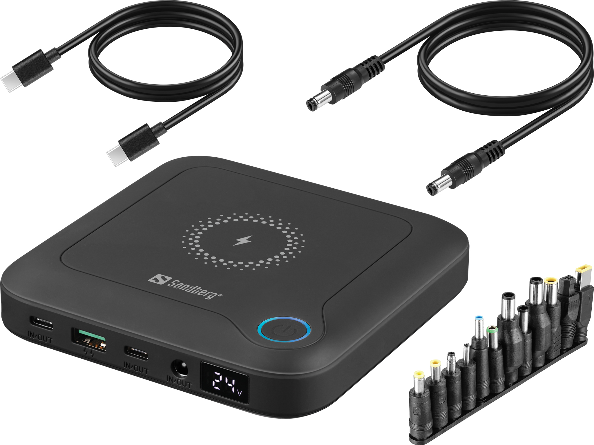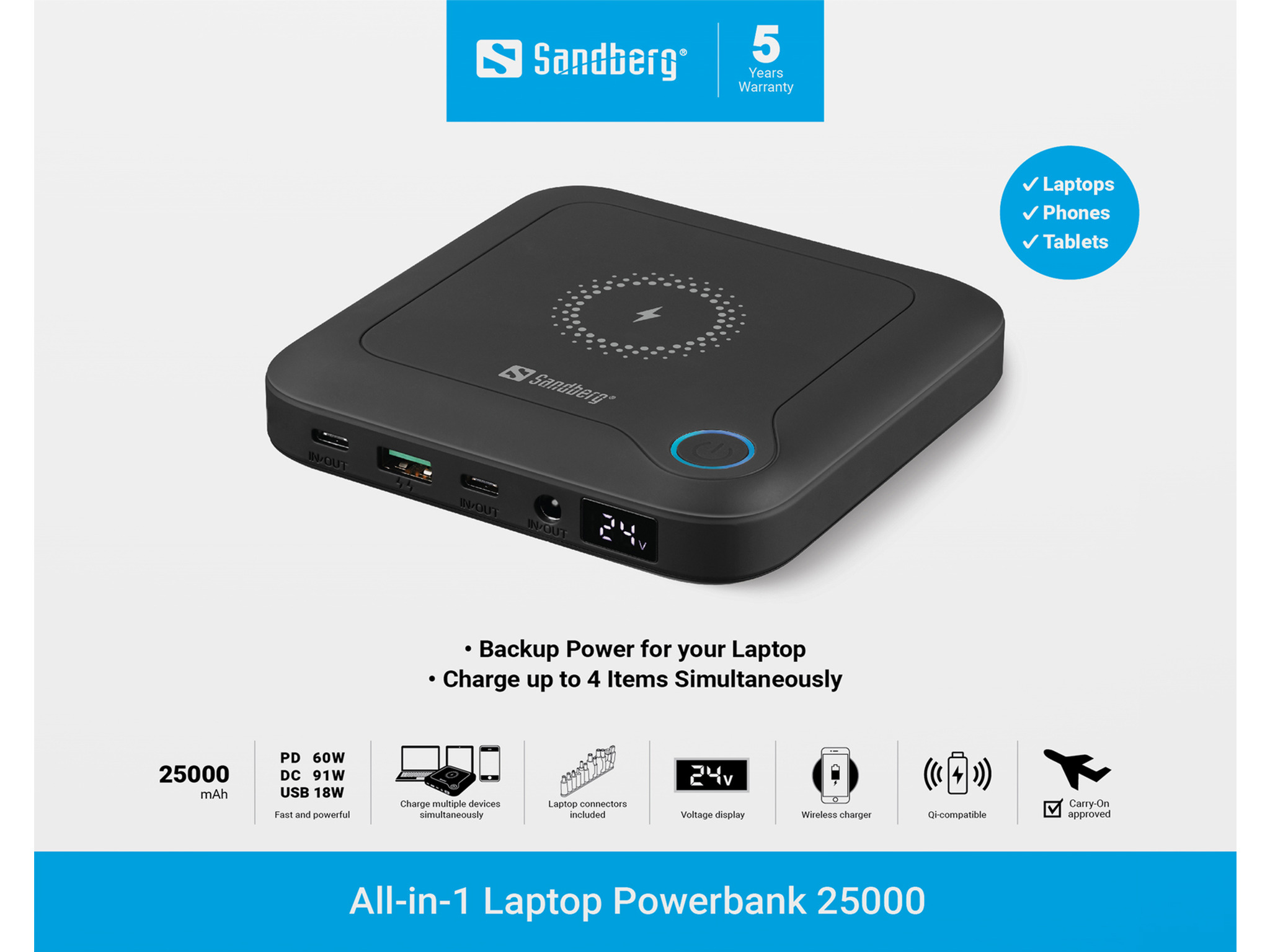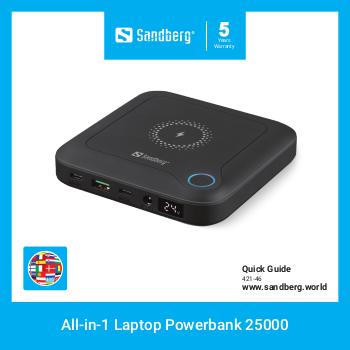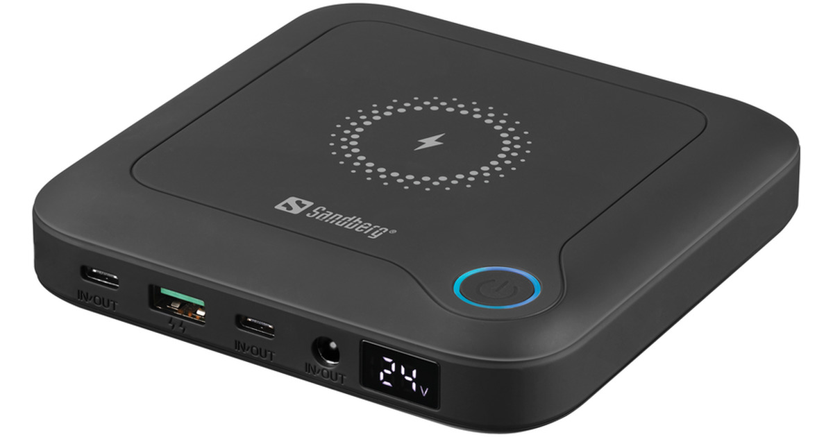 Sandberg All-in-1 Laptop Powerbank 25000 ir tava mobilā enerģijas avots ierīcēm – ieskaitot tavu klēpjdatoru vai MacBook. Ar jaudīgu 25,000 mAh akumulatoru tu iegūsi pietiekami daudz enerģijas vairākiem viedtālruņa uzlādēm vai vairākām papildus darba stundām uz klēpjdatora. Powerbank ātri uzlādējas caur USB-C vai DC-in un nodrošina enerģiju no USB-C, USB-A un DC izejas. DC izeja ir regulējama no 12–24 V un, izmantojot adapterus, var tikt pielāgota lielākajai daļai klēpjdatoru ar DC ieeju, padarot to viegli pielāgojamu plašam ierīču klāstam. Turklāt, integrēts 15 W bezvadu ātrās uzlādes lādētājs ļauj uzlādēt viedtālruni pilnīgi bez vadiem. Ar kompaktu dizainu un svaru tikai 500 g, powerbank viegli ietilpst tavā somā un ir ideāls rezerves enerģijas risinājums, kad esi ceļā, birojā vai ceļojumā.